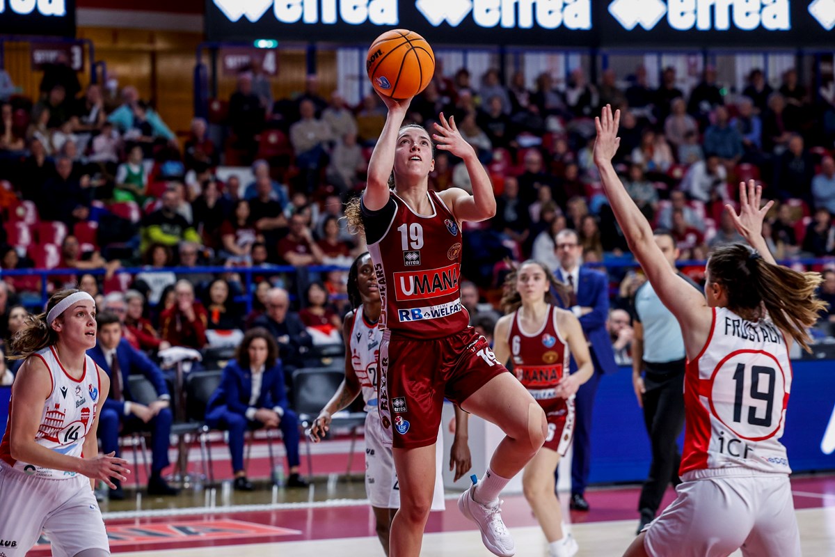 UMANA REYER VENEZIA: Villa M. 12 (4/6, 1/1), Delaere 11 (1/1, 3/6), Pan NE, Madera* 5 (1/3, 1/4), Yasuma* 2 (1/4, 0/2), Fassina* 8 (3/6, 0/2), Santucci NE, Shepard* 25 (11/16, 0/1), Kuier* 21 (7/9, 2/3), Nicolodi 2 (0/2, 0/1)