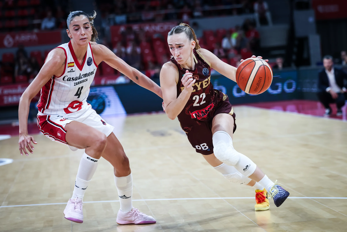 Due su due per l'Umana Reyer Venezia, che vince 84-80 sul campo di Casademont Zaragoza e sale da sola al comando del gruppo D. Partenza ottima per le padrone di casa, che vanno sull'8-2 con sei punti di Fingall, che poi realizza anche il canestro del massimo vantaggio sul +8. Venezia risponde al momento di difficoltà iniziale con un parziale di 13-0, trovando il sorpasso con Fassina in chiusura di primo quarto. Una tripla di Holmes porta anche a tre possessi di vantaggio, poi Hempe pareggia con sette punti consecutivi. Zaragoza chiude in vantaggio 40-38 un primo tempo molto intenso, grazie a un canestro di Ortiz.