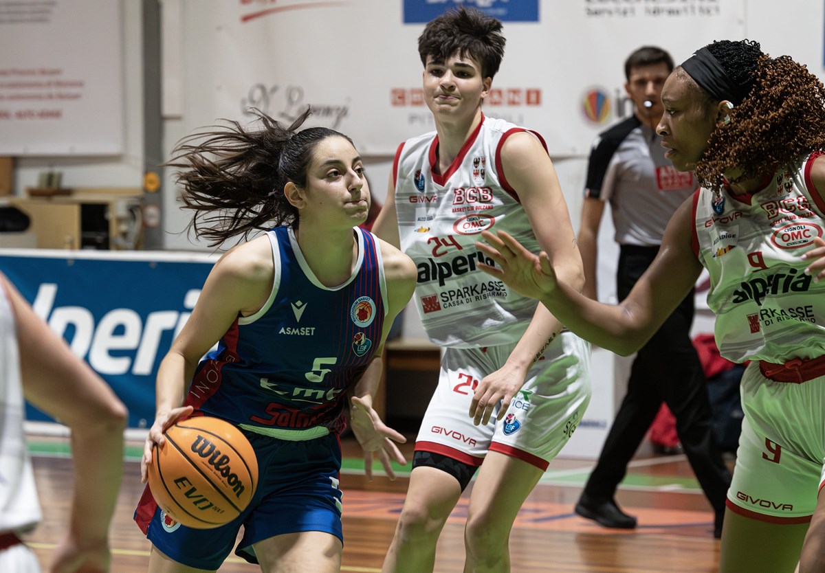 Parte alla grande la formazione di casa, capace di prendere un vantaggio considerevole fin dalla palla a due grazie ai canestri di Giulia Cecili (15 punti) e Giulia Manzotti (14). È solo negli ultimi minuti della prima frazione che le rodigine riescono a prendere il controllo del punteggio: la tripla di Nina Stavrov (11), grazie all'assist di Laura Cremona, porta lo score sul 19-20 allo scoccare dei 10'. Nel secondo periodo la Solmec prende vantaggio grazie ad una buona difesa di squadra nella prima parte, raggiungendo anche le 9 lunghezze di vantaggio grazie ai canestri di Sara Zanetti, faro dell'attacco rodigino. Negli ultimi due minuti del primo tempo Alice Malintoppi, sorpresa della partita, segna due canestri importanti che portano il punteggio sul 33-35, complici qualche errore della Rhodigium.